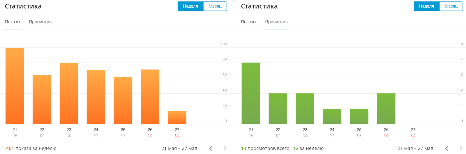 Тут намного интересней. Статистика делится на просмотры и показы, чтобы было удобно я картинку подредактировал.