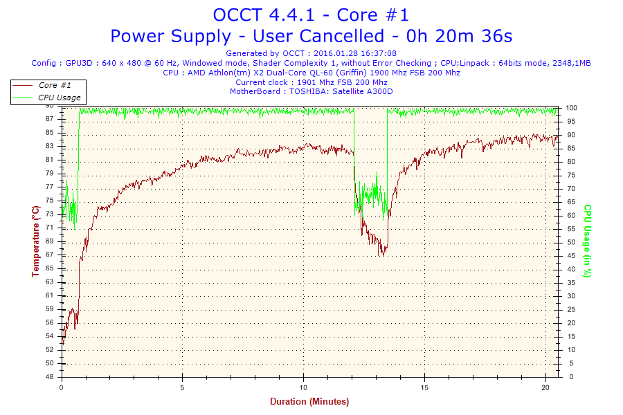 Итог: на максимальной нагрузке температура подбирается к 85°С. Это означает, что система охлаждения сделана без запаса на перегрев. Toshiba Satellite A300D — говно!